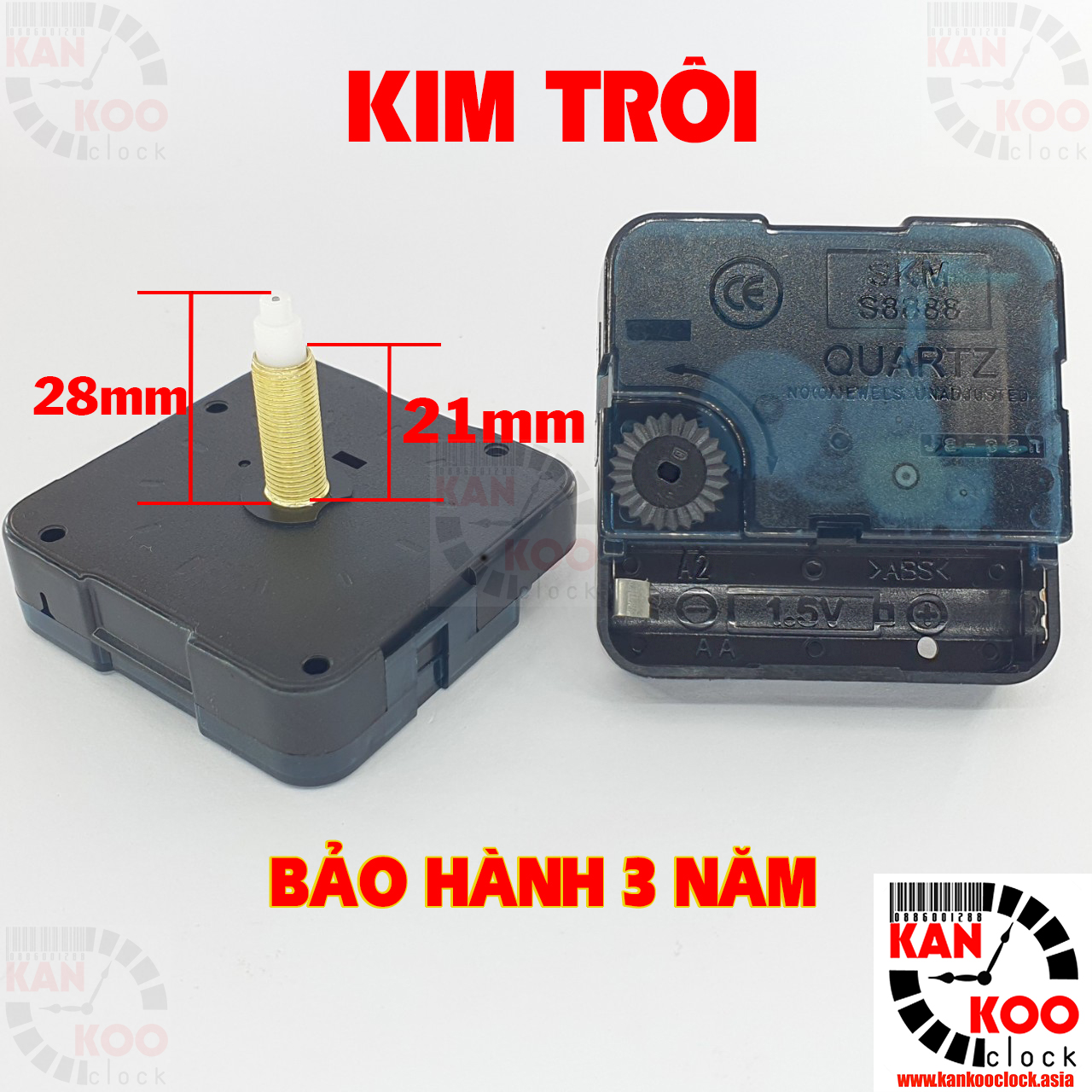 Kích thước : 56mm*56mm, Tổng chiều dài cốt máy đồng hồ 18mmm (từ mặt máy đến đỉnh kim phút).